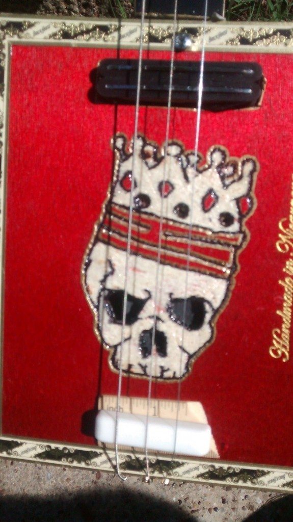 Previous Image Next Image Piht Bull A hand-carved (with an Xacto knife) Skull & Crown sound hole design on a cigar box guitar, by Piht Bull.
