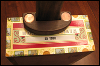 The sound box is the body of the instrument and for a CBG it consists of a cigar box. Cigar boxes come in a wide range of styles, sizes and shapes, with greater or lesser degrees of decoration. Some are fairly simple bare wood boxes with some simple logos/text branded into the surface. Others are large, intricately ornate pieces of art. These fancier boxes tend to be a lot harder to get ahold of, reserved for the most expensive cigars and special limited-edition releases.