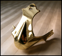 There are a host of possibilities when it comes to dressing up your headstock with metal hardware. Brass door pull plates can be screwed on, small grommets/bushings can be set into it in a decorative pattern; coins, metal scrapbooking accents and other small metal decorations can be screwed/tacked/glued on; you can even carve your own unique metal pieces out of brass, copper or aluminum. Always keep your eyes open at the hardware or craft store, as you can often find items meant for other uses that would make very nice decorative accents for your CBG.