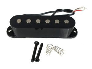 A magnetic pickup, on the other hand, is composed of copper wires carefully wound around a number of magnetic poles, usually one pole per string on the instrument it’s to be used on. The way the pickup works is that when the magnetic poles are mounted close to steel guitar strings, and a string is plucked, the vibrating string interacts with the pickup’s magnetic field. This interaction causes a small amount of electric current to be produced in the pickup’s wiring, which is then picked up and amplified by a guitar amp. The magnetic pickup does not react in any way to the acoustic vibrations of the instrument it is in, only the vibration of the strings. Because of this, the same magnetic pickup will produce much the same sounds whether it is mounted in a standard electric guitar, a cigar box guitar, or a guitar made out of a cinder block. The only real requirement is that the pickup be close enough to the strings so that they excite the magnets sufficiently.